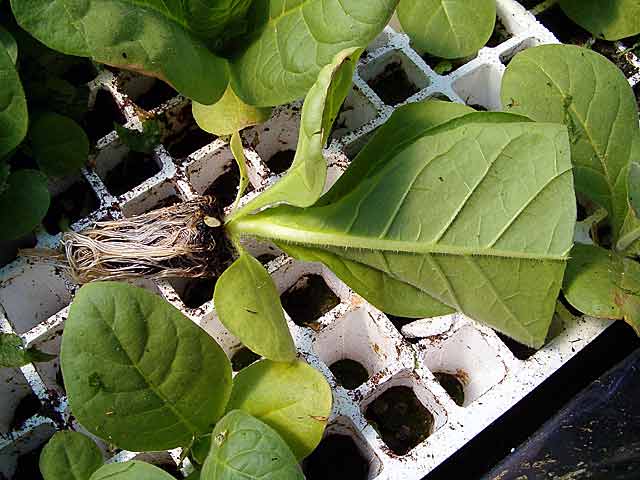 "Mešina" "poSred" fotografije je klasična kosačica za travu, koja je posta'ljena na pokretne nosače i koja kosi rasad duvana na "određenu meru". Za "daljni" proces, jako je važno da isti "bidne" jednake veličine iz više razloga, a najznačajniji je da se "odcecanjem" vrha postiže ubrzan razvoj korena biljke, što je jako bitno pre rasađivanja "naNjivu". Ovo je već drugi put da se ponavlja ova "aperacija", a kako sad' pojedinačno izgleda rasad, pogledajte na "sledeću fotografiju":Već sad' se vidi kako je korenov sistem gust, jak i zdrav, tako da će se za nekol'ko dana početi "sas" rasađivanjem...