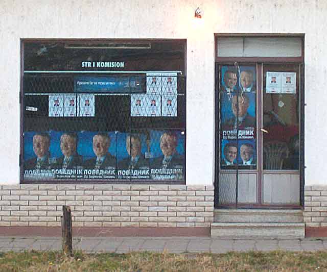 "Demokratcka" stranka je imala posta'ljen štand "isprid" pošte, a Kurjački, koji je "nosijoc izvestne" liste za Vojvodinu, je doter'o jedan veliki, veliki "aftobus, sas" nalepljenom njegovom slikom...