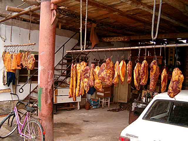 "Odena naSliku" vidite samo jedan "devo izoTog" arsenala: slanine, "kremenadle", pečenice, a koje su "posla" dimljenja posta'ljene da se "proSušidu naVetar". Ono što fali su: kobasice, "majuške" ( urke... ), krvavice, "džege" ( švargle... )...