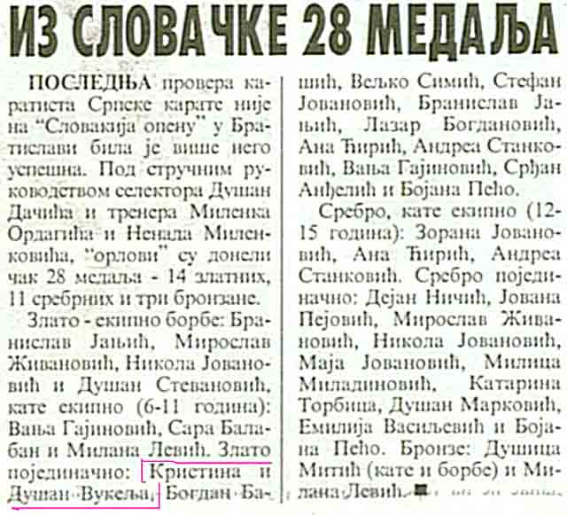 Opis: 26-og maja 2007-me godine, u Slovačkoj je održan internacionalni turnir u karateu, gde su dva člana našeg Karate kluba MLADOST reprezentovala Srbiju i naravno, Vukelja Kristina i njen mlađi brat Dušan su osvojili zlatne medalje...