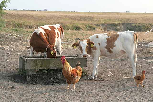 Osim konja, na Nikolin salaš ima krava, teladi i peradi, al' što ima velikog petla, ta to je za neverovati - pogledajte kol'ka je kokica desno u odnosu na njega...