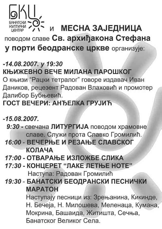 Opis: Pravoslavna Crkvena "obština" Beodra svakog 15-og avgusta, na Prenos moštiju Sv. arhiđakona Stafana, ima Crkvenu slavu. "NaSliku" se "vididu" pripreme, od dan ranije "isprid" porte...