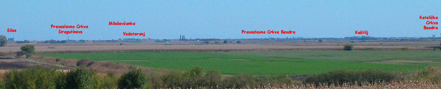 Opis: Mada je "kodNas sve ravno, kažedu" da se Novo Miloševo "izDalje" vidi "najLepče sas" dolme reke Tise, "dvanajst" kilometara "doleko" prema severu i severozapadu - pa da vidimo kako to izgleda "uVeličato":