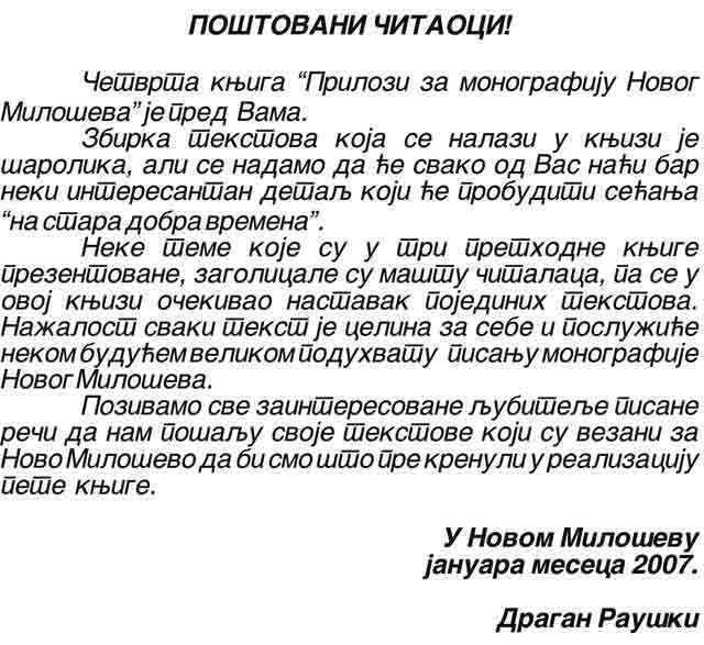 Opis: Imamo nešto dobro "zaVas", a to je knjiga: Prilozi za Monografiju Novog Miloševa - Knjiga četvrta, koju smo najavili još "naSliku" dana od 22.04.2007-me...