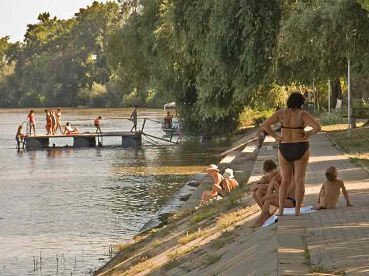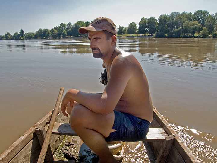 "NaŽalost", Tisa je bila "zdravo jako" brza i visoka, pa skela nije radila, al' nas je "zaTo" skeladžija "sas čamcom priVezo" preko na Bačku stranu i to zajedno "sas" biciklovima...