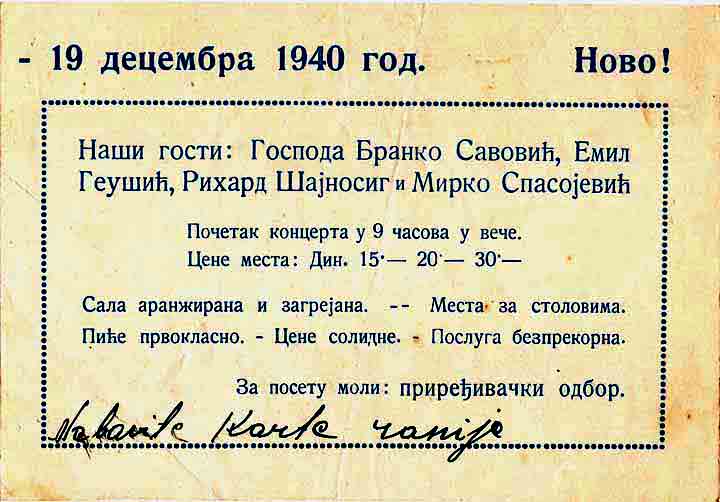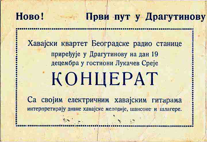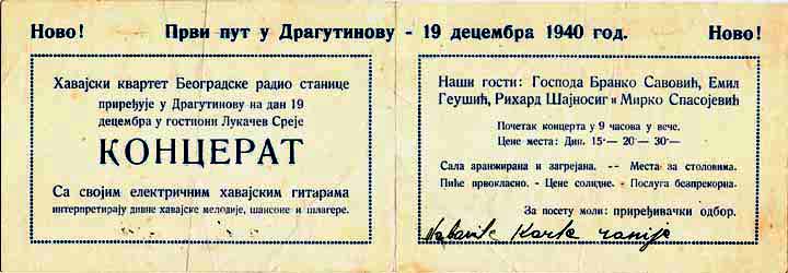 Nešto na šta se naišlo ovih dana je pozivnica gospodinu Vrgović Isi - opštinskom blagajniku iz Beodre, na "koncerat Havajskog kvarteta", Beogradske radio stanice u Dragutinovu 19. decembra 1940. godine u gostioni Lukačev Sreje.