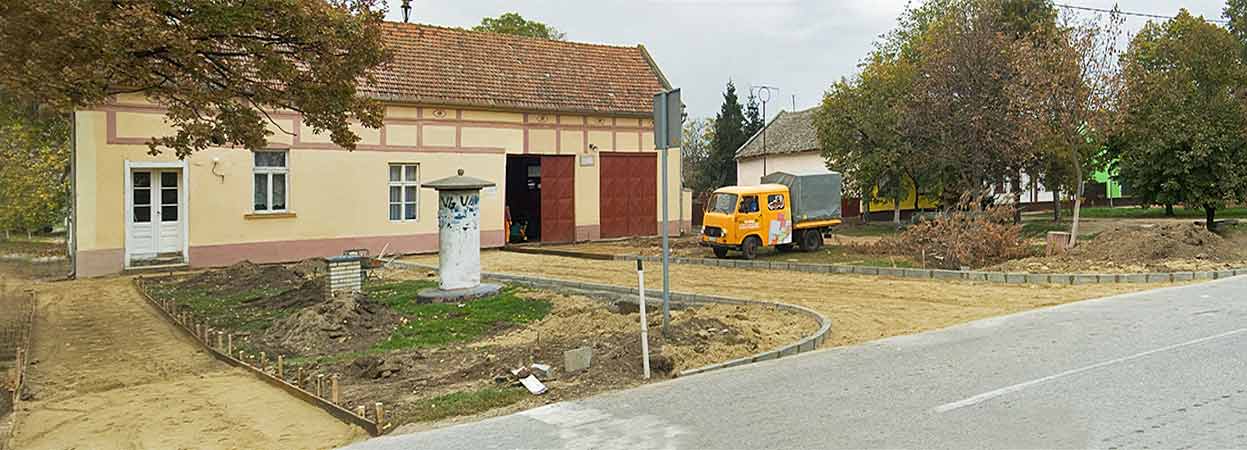 Prostor izmeđ' zgrade i puta je oduvek "bijo travnat, a sas naSipinama" različiti' vrsta za prolaz vatrogastni' vozila. Skoro "vek i po unatrag" se tu donosila i razvlačila "šljaka" ( trvdi ostatak sagorevanja visokokaloričnog uglja... ) "sas željezničke" stanice il' "cigaljne", a zadnji' godina se "uTu svrhu koristijo" lomljen crep...