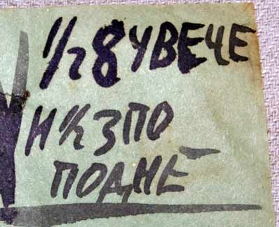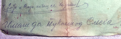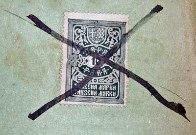Dolena desno se vidi nalepljena TAKSENA MARKA Kraljevine Jugoslavije, od ondašnji' deset para ( očito nije bilo inflacije "kav danaske", ... ) i to "samoPreŠkrabata" prvo "sas mastiljavom" olovkom, pa "ondak" još i crnim tušom. Za "pritPostaviti" je da ovo nije bila jedina "plekata", al' da je "ukupan" broj "bijo" smanjen, zbog "cene koštanja takse po plekati"...