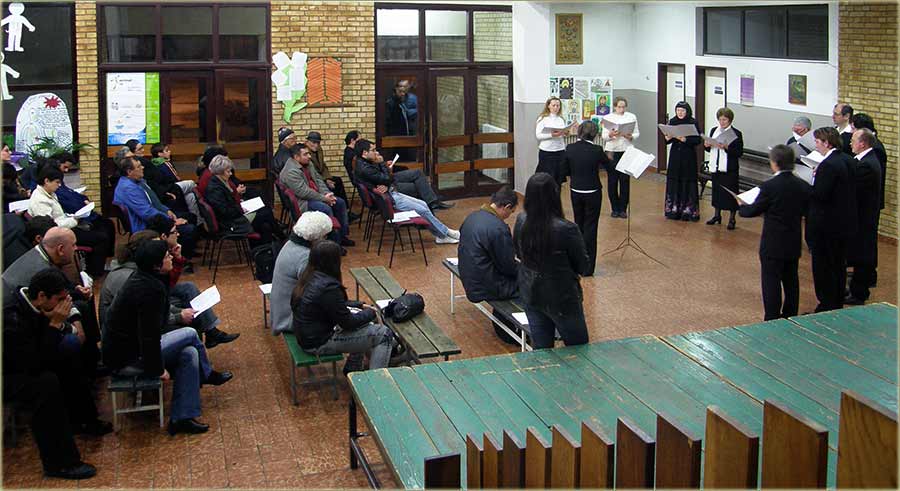 Na repertoar' su bili "grigorijaski" korali, a pre izvođenja svake pesme, voditelj je pročit'o prevod "sas latimskog", a na "srbski" jezik...
