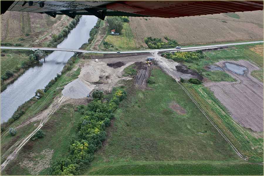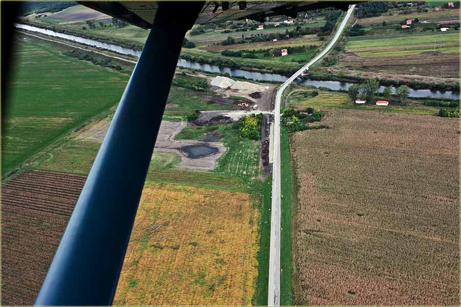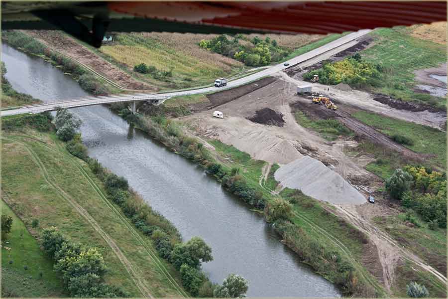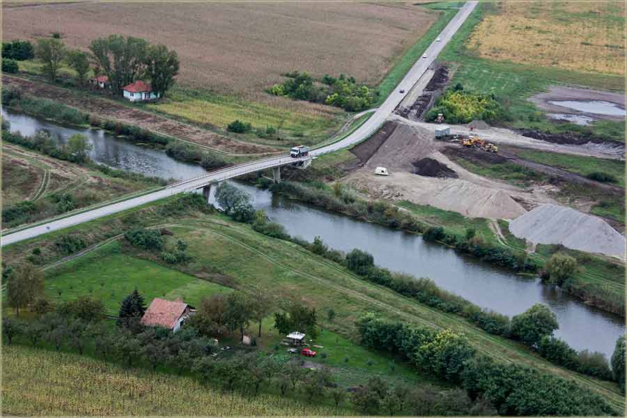 Znači, desno "ot" mosta, "drum" vodi ka Kikindi, a levo ka Miloševu. Kad' se gledi iz "avijona ta trane", krivina "posla" pravca iz Kikinde ne izgleda da je oštra, no kad' se još "malko" približite, vidićete da to baš i nije tako...
