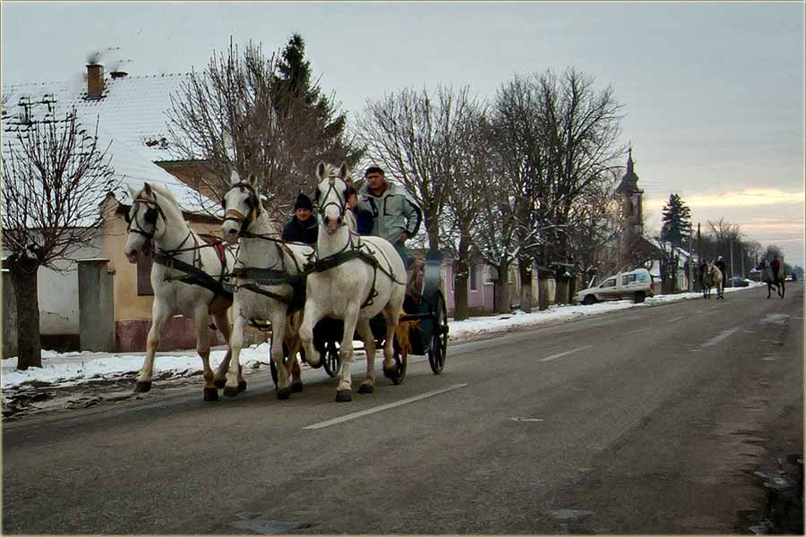 Opis: "Kav" što "cigurno" već znate, "kodNas" u "Miloševo" je običaj, da na "prvi dan" Božića, momci "jašidu" konje, a "nađe" se tu i "poKoja" zaprega...