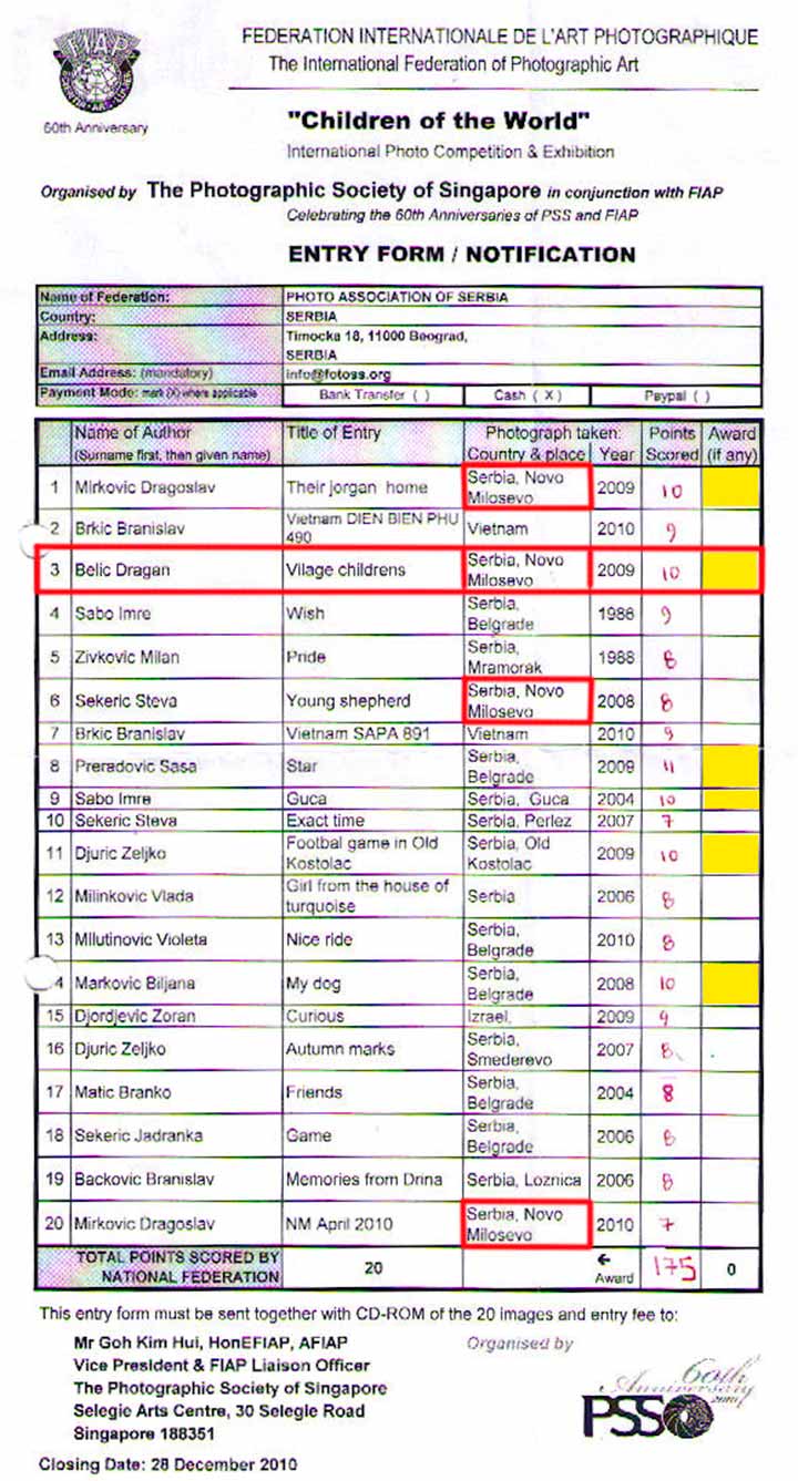 Opis: Na "FIAP-ovo takničenje" - Children of the World International Photographic Competition ( Deca sveta ), koje je ove godine "obdržato" u Singapur', Srbija je "sas" 20 fotografija osvojila 175 "pojena", zauzela osmo mesto i Mention Honorable FIAP, za kolekciju fotografija...