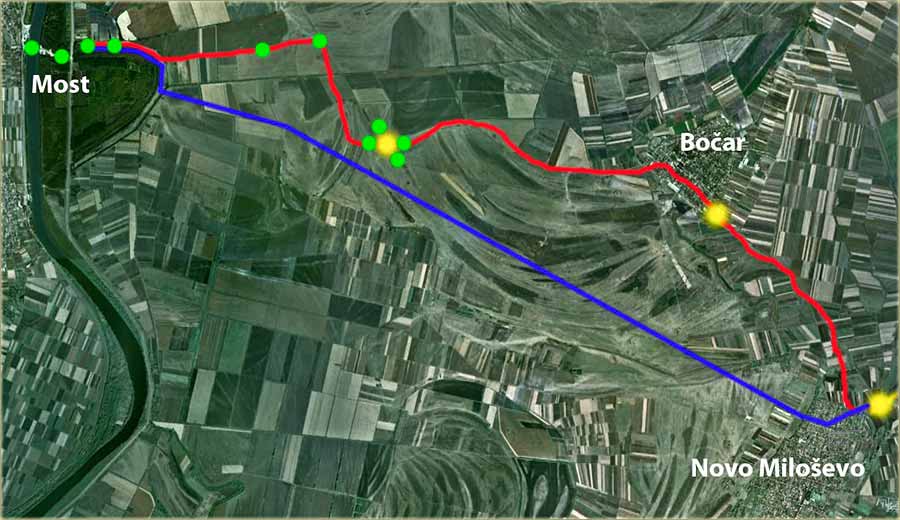 Crvena "štrafta naMapu predctavlja" put, kojim bi trebalo da se ide do mosta i to "priko" Bočara, uz uslov da se "naPravidu" dva nadvožnjaka "priko" pruge Novo Miloševo - "Subatica" i proširi deo "postojećog" puta Bočar - Padej...