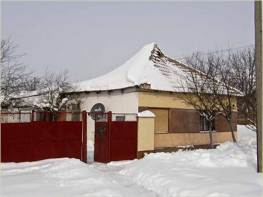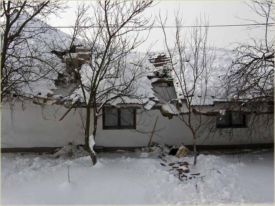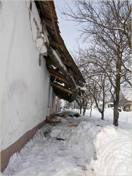 Opis: U "Pijonirsku" ulicu, "numera" 48-om, "prikSinoć" se usled snežnog tereta, "strušijo" krov porodice Gucul...