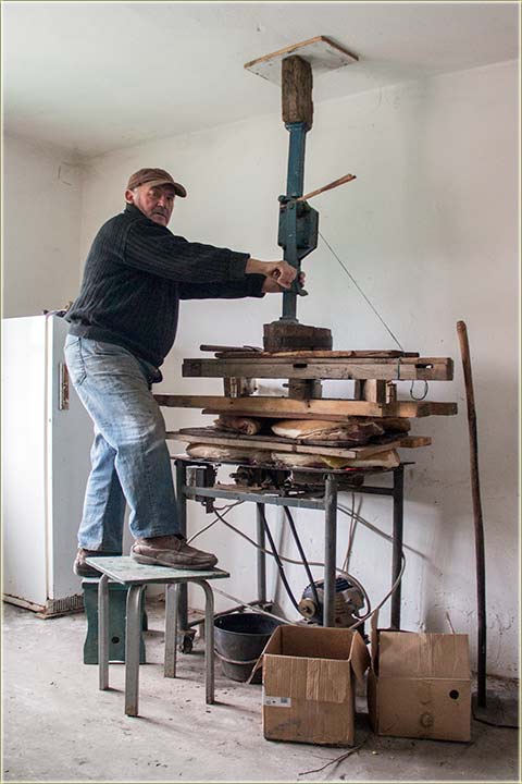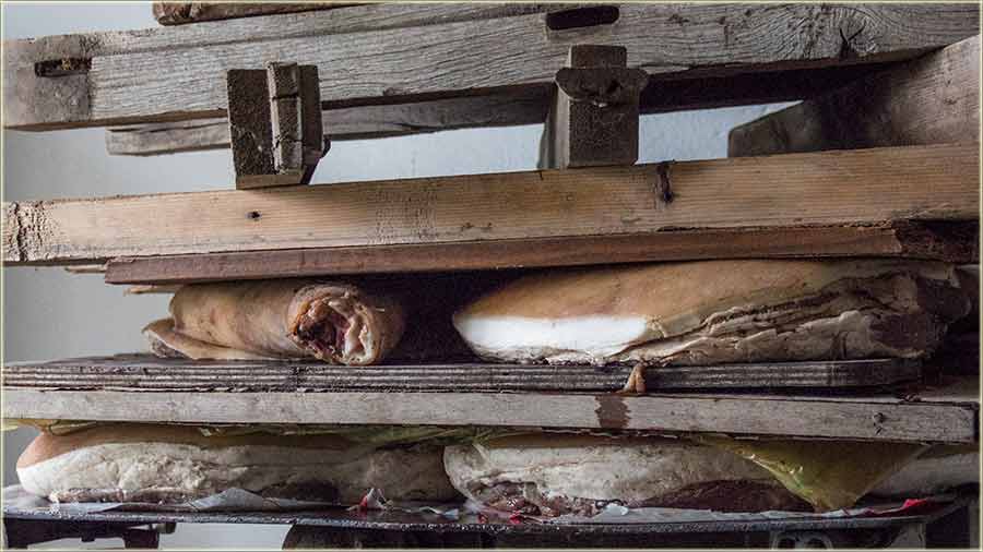 Daklem, kad' se "izVadidu" iz salamure, šunke se prvo "presujedu sas (* furdančetom *) vintom", da bi se ocedile i napravile, da "bidnedu" jednake debljine...