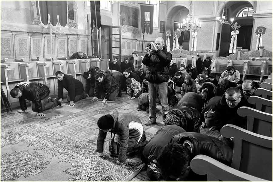 Fotografija je nastala u toku ispovedi, prilikom Sv. arhijerejske Liturgije Sv. Apostola Jakova, Brata Božijega, u momentu kada se čitaju delovi Starog zaveta. Za mnoge je neuobičajeno, da pravoslavni vernici prilikom službe, klečeći, čelom dodiruju zemlju, okrenuti ka crkvenom oltaru...Okrenuo sam se unazad i napravio nekoliko fotografija, od kojih sam odabrao ovu, na kojoj je, da tako kažem, kolega fotograf, naglo ustao i sâm napravio nekoliko fografija, bez obzira na okolnosti...