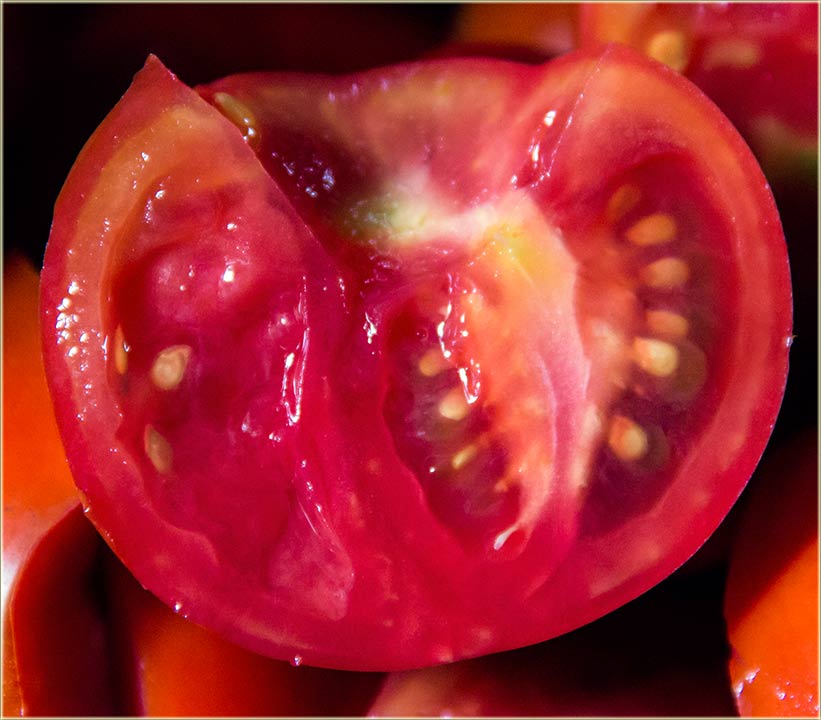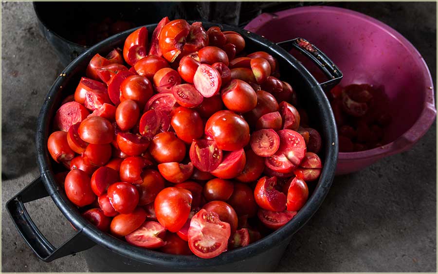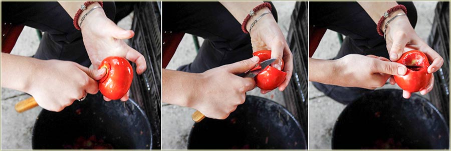 "Posla" tog', plodovi se dobro "oPeredu" i "ondak nastupadu" zlâtne i spretne "žemske" ručice, koje "sas nožom oČistidu" paradajz od korena i bilo kak'i nepravilnosti i "priPolovidu" ga...