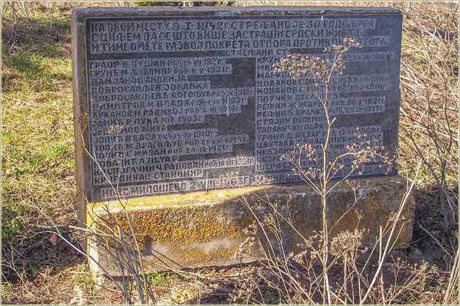 Savez boraca NOR-a iz sela je 2.8.1963. podigo ovim nedužno streljanim ljudima na mestu di se to dogodilo velik spomenik. Kad sam bio mali sećam se da nas je vaspitačica ( Smiljka) tu dovodila u šetnju i pričala nam oTom događaju. To sam mesto utuvio (upamtio) kao jedno od lepši u selu. Na tom mestu se nalazi brdašce visine 5-6 metara i prečnika 20 metara. Naokolo je bila ograda koja je dolena 30 cm betonirana a onak gorena od 1 metra gvozdena bordo ograda sas stubovima od šina. Od kapije do spomenika je bila staza od 25m koja se penjala u visinu. Sas obe strane staze je do gorena bio drvored Tuja a gorena dva kestena. Nuz samu stazu naSkroz su bile crvene ruže. I bila je jeda od betona livena klupica da svaki koji dođe može da sedne i razmišlja. Ta milina jedna.