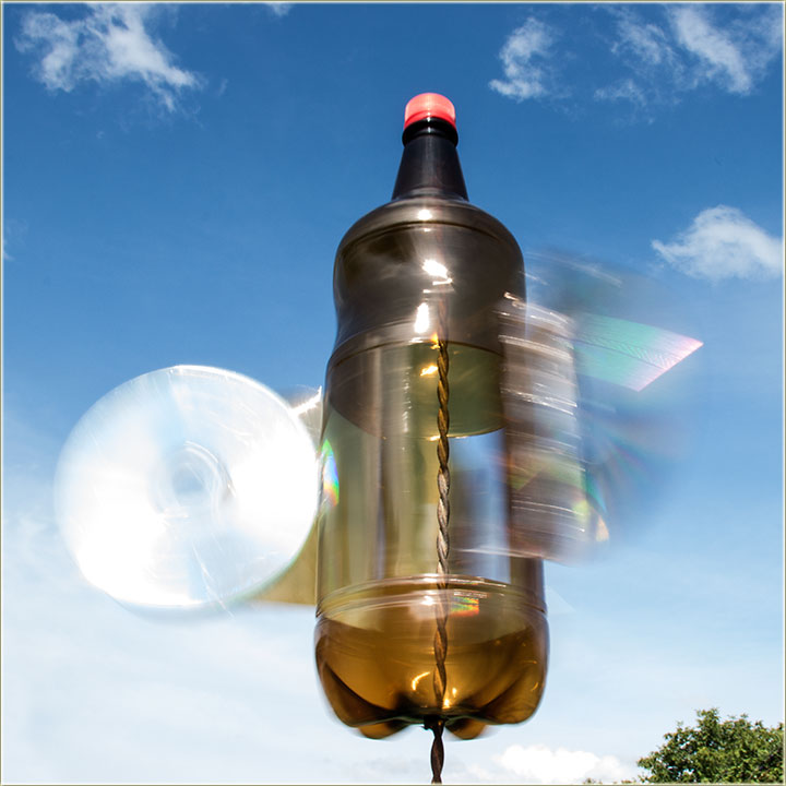 Ništa naročito: "poTrošena", plastična, pivska flaša i stari CD-jovi il' DVD-ejovi, zalepljeni pomoću pištolja za plastiku...