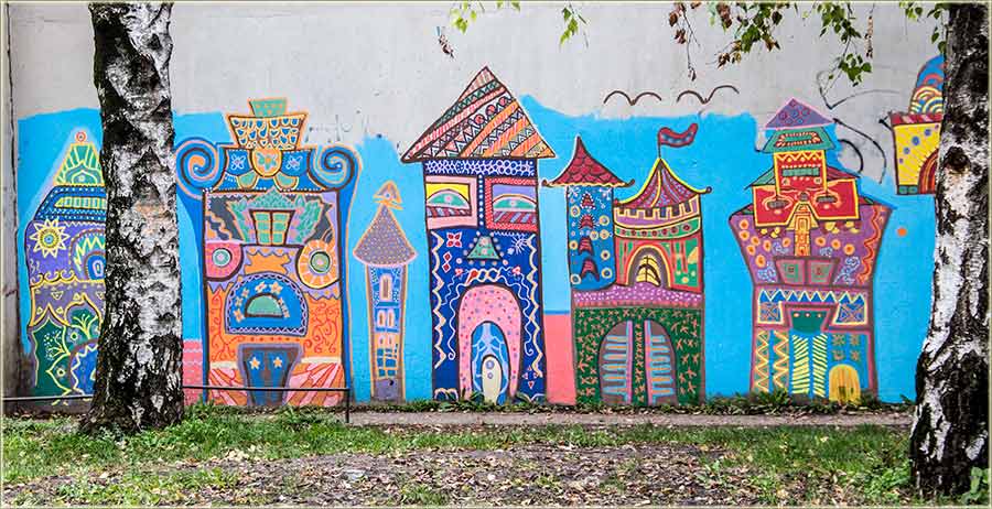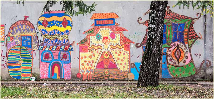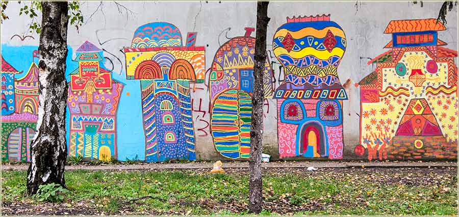 Kako ima drveća, izmeđ' murala i "kav" posmatrača, evo ga iz tri "slike sLeva", pa "naDesno"...