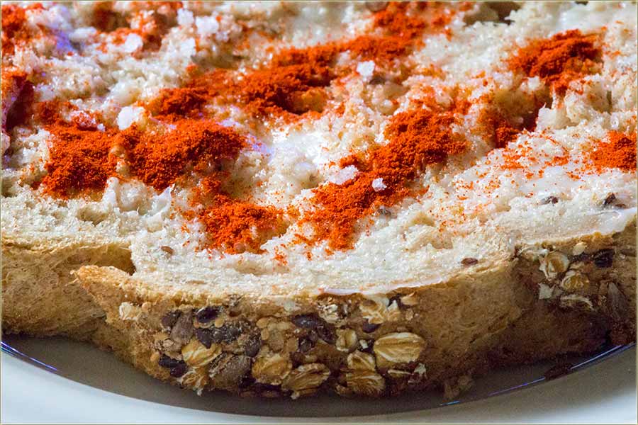 Opis: "Očijo" ja, "jučeraske zâjtra na" internet, kad' ono, neko je "metijo sliku sas" dva komada 'leba - "sMâšćom" i paprikom i napis'o: