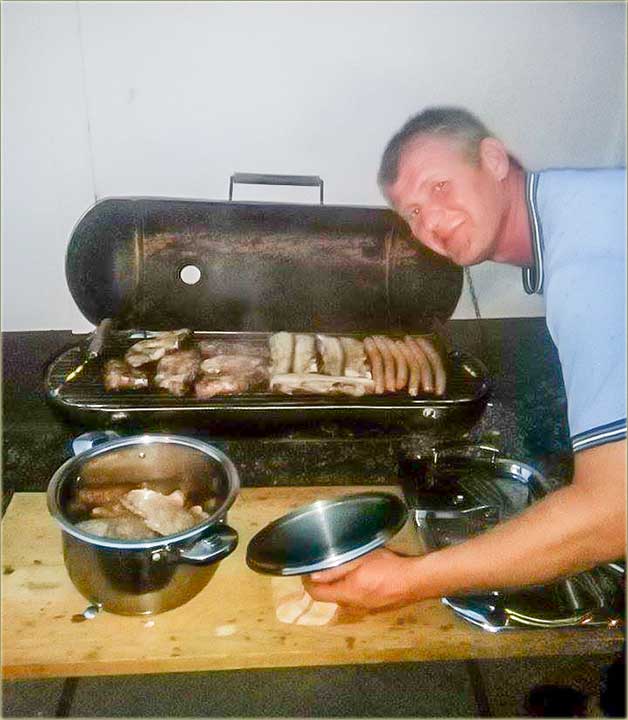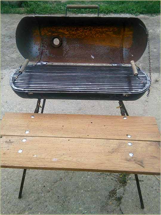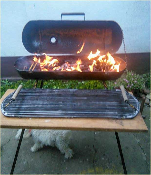 On je "daklem priPolovijo" staru plinsku bocu od "afta, udarijo" šârke "sas" jedne strane, "kav" i ručku za podizanje poklopca, zatim je "izVarijo" roštiljsku rešetku, dod'o nogâre i "uGradijo" dve daske, "kav" policu za pribor i meso !!!