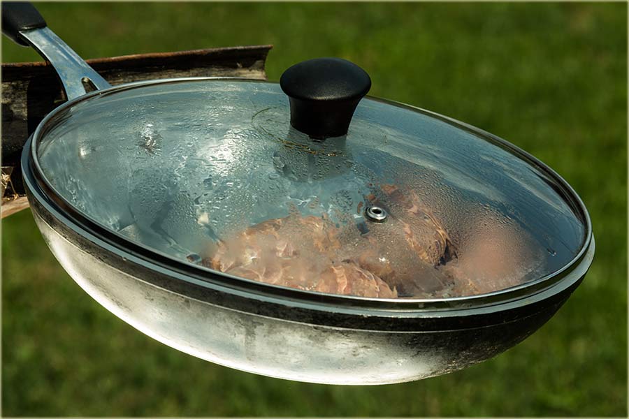 "PriTim" moram "naPomeniti", da "Cunce" nije stalno sijalo, neg' je povremeno bilo iza oblaka, al' pošto je tiganj masivan, s'kupljenu toplotu je odav'o i "uTim perijodima"...