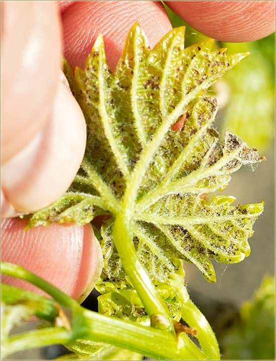 Na "naslovnu fotografiju" vidite, kako se neka "zgadija" naselila ispod lista vinove loze i isplela sitnu "pavučinu", a na sledeću, neku "boleštinu" u vidu crni' pêga !!!