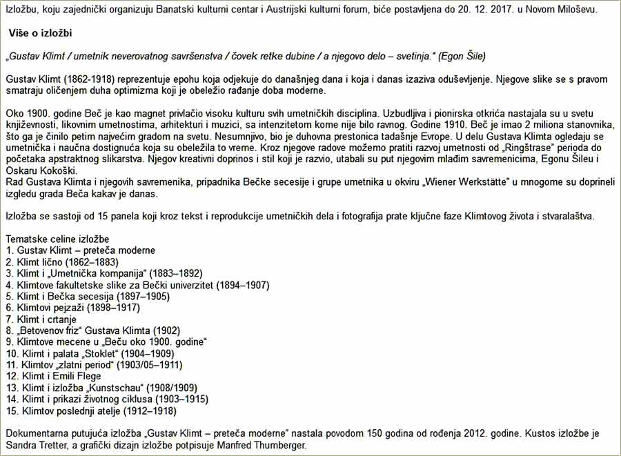 Opis: Dokumentarnu izložbu "Gustav Klimt preteča moderne" otvoriće Johanes Iršik, direktor Austrijskog kulturnog foruma u Beogradu, 20.11.2017-te, u 19 časova, u Galeriji Banatskog kulturnog centra u Novom Miloševu.
