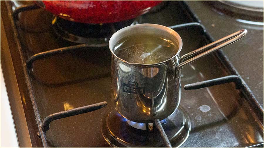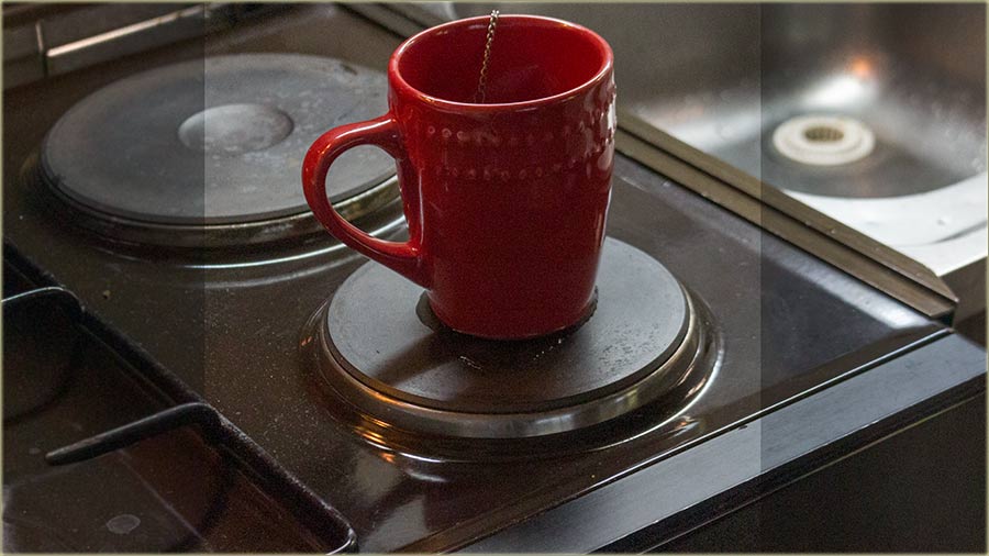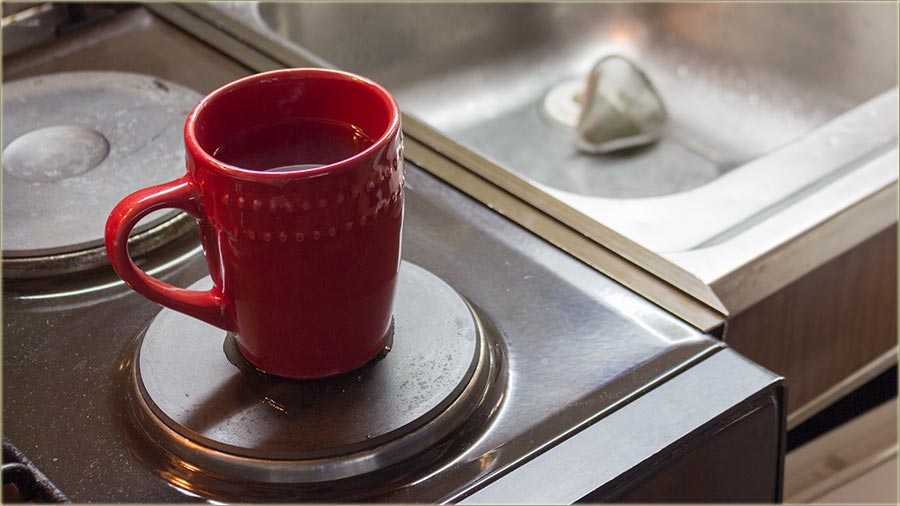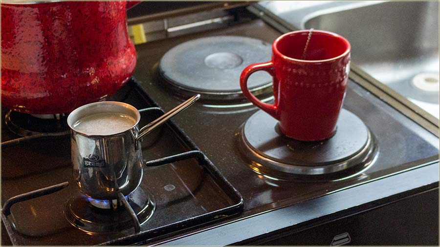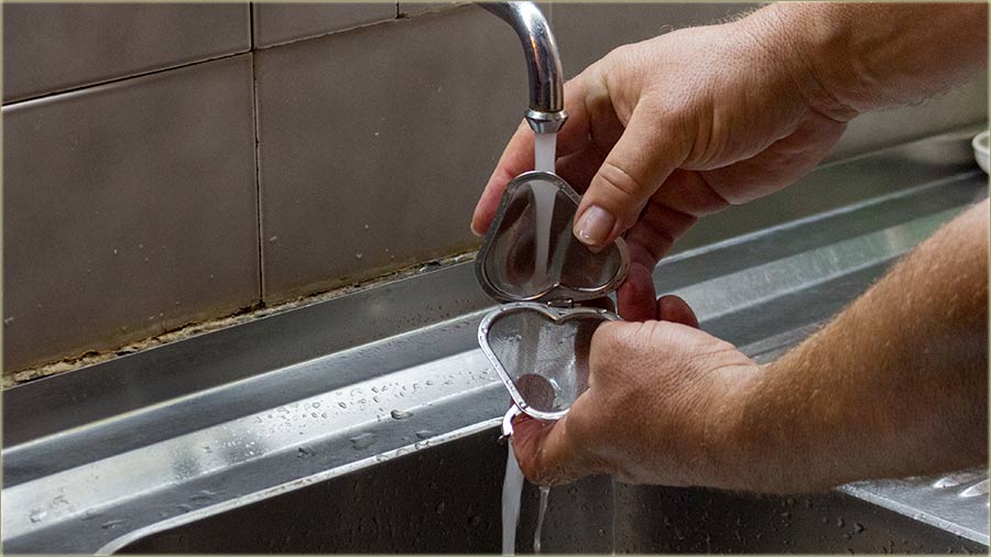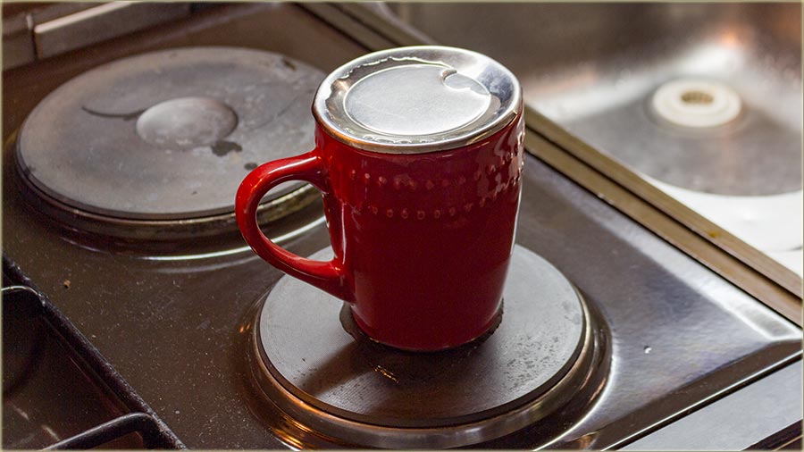 Pre neg' što "cediljku tûrim" u "omiljenu mi šolju", ja na ono udubljenje od ringle, uspem jednu kašiku 'lâdne vode, pa je tek "ondak postavim", a da bi se bolje i brže 'lâdila...