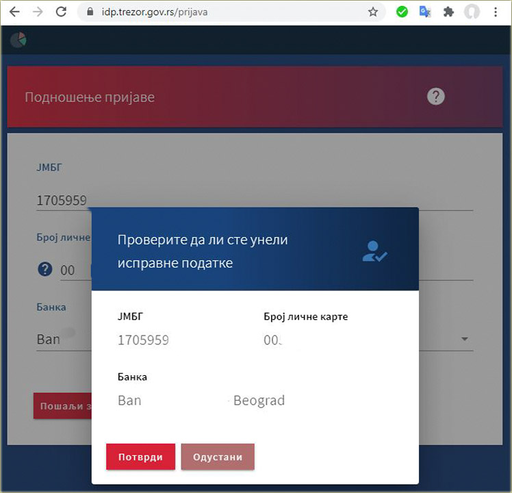 2. Kliknite na - Podnošenje prijave ( velika, crvena površina... )...E tu, treba da upišete Vaš JMBG i broj lične karte ( il' za onog', "kojog preJavljivate"...). Takođe, treba da se opredelite za banku, a na "koju" treba da "legnedu" uplate, tako što ćete "klikniti" na strelicu "naDole", desno, iznad crte, u "treći" rêd'...