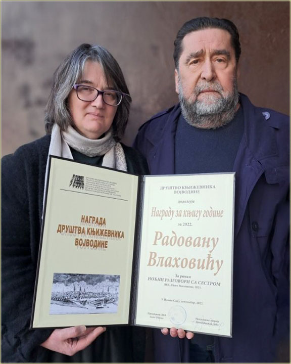 Opis: "Našom" književniku, Radovanu Vlahoviću ( "ot" Kaljugini'... ), je u "subatu" 18-og ovog', uručena Nagrada Društva književnika Autonomne pokrajine Vojvodine, za roman - Noćni razgovori sa sestrom...
