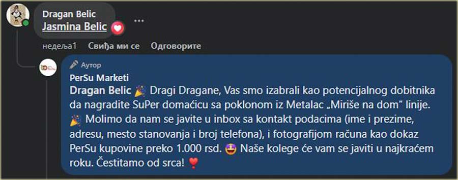 ..., koja je, "kav" što vidite, uskoro postala dobitnica i tim' "aftomatcki" postala SuPer domaćica i osvajačica poklona iz Metalca - "Miriši" na dom "lênije" !!!
