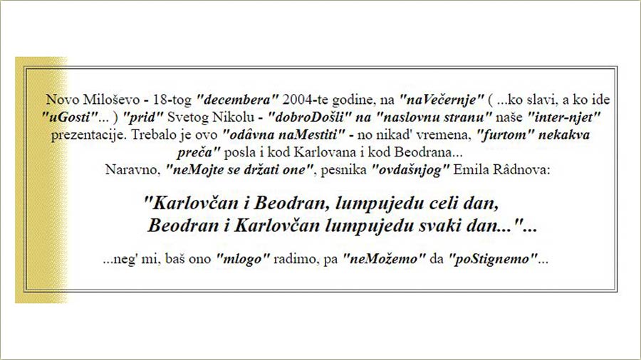 I to je u "osnovu", pre "devetnajst" godina, prvo "očilo" na internet, a iz Novog' Miloševa, "priko" servera iz Novog' Bečeja, vlasnika Kiš Roberta...