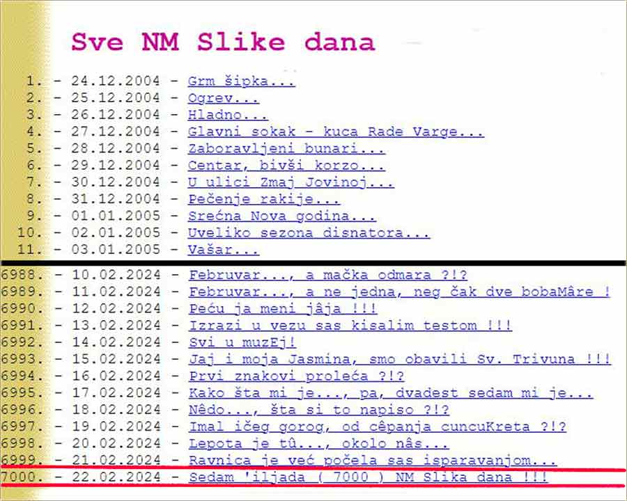 Sedam 'iljada, svakodnevnog' druženja "sas" Vama, od 24.12.2004-te, pa sve do "danaske" 22.02.2024-te i to u "dvadesetu godinu izlaženja" !!!