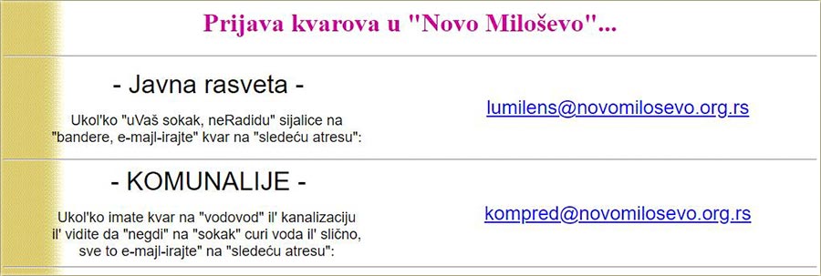 Nekako, "naŽalost, otKad" su naPR'Dnjaci došli "naVlast uNášu, novobečejsku obštinu", to je "aftomatcki" ukinuto i od "ondak", po "njinim" običajima, niko više "niZaŠta neVodi" računa, o "našim" selu, a nit' odgovara za "neBrigu", tako da nema kome ni' da se "preJavi" !!!