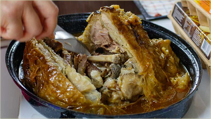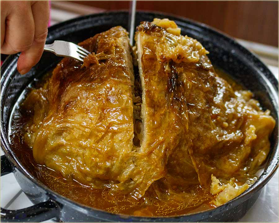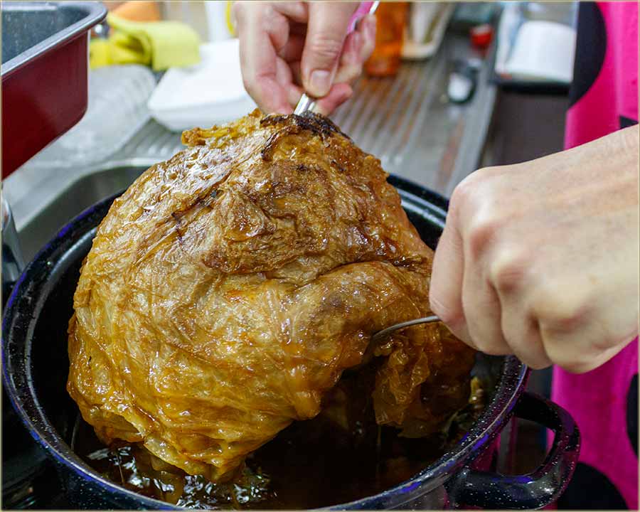 Ovako..., "sirava", svinjska butkica, se uvija "sas lišćom" i napravi se kûgla, "kav" da je nenačeta glavica kupusa i "ondak" se "metne" u "lêrnu" i krčka "poLagâno" tri, četir' sâta...