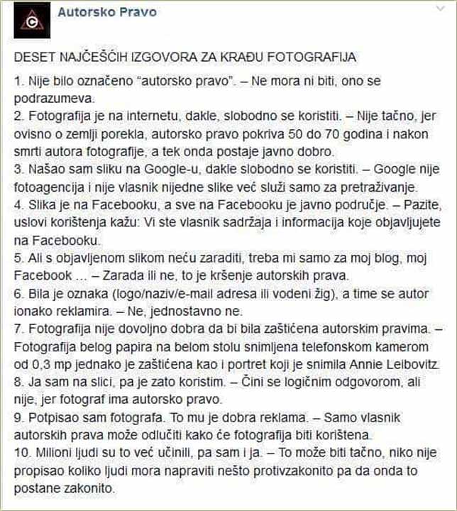 Ako nekom, čak i ovo nije dovoljno jasno, pa se i dalje "pravi Tôša", nek' "proŠtudira" - ZAKON O AUTORSKOM I SRODNIM PRAVIMA ("Sl. glasnik RS", br. 104/2009, 99/2011, 119/2012, 29/2016 - odluka US i 66/2019) !!!