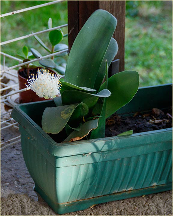Opis: Slonovo uvo iliti 'iljadu svêća iliti Slikarska četkica ( "latimski" - Haemanthus albiflos ... ), je cvećka, koju mâzi i pázi "moja, doleko, bolja, polovina" Jasmina, a dobila je od njene prijateljice Veselinke Veskov, koja "odâvna" živi i radi u "Kikindu"...