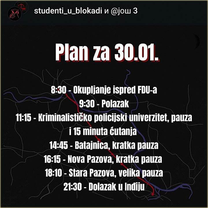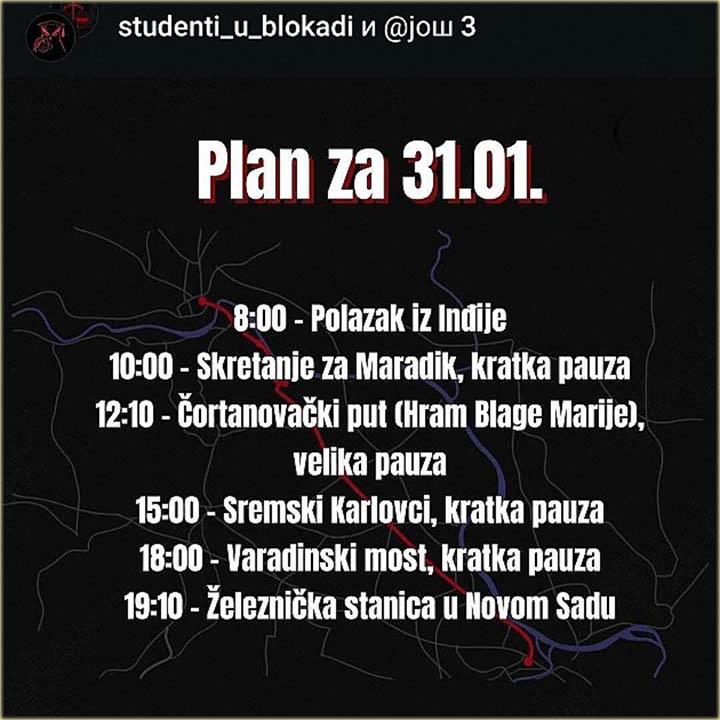 Opis: Studenti iz "BeVoGrada, danaske krećedu peške" u dvodnevnu, protestnu šetnju do Novog' Sada, kako bi 1-og "februvara" učestvovali u "akciju blokiravanja" sva tri mosta, na koju su i' pozvali "novosadcki" studenti !!!