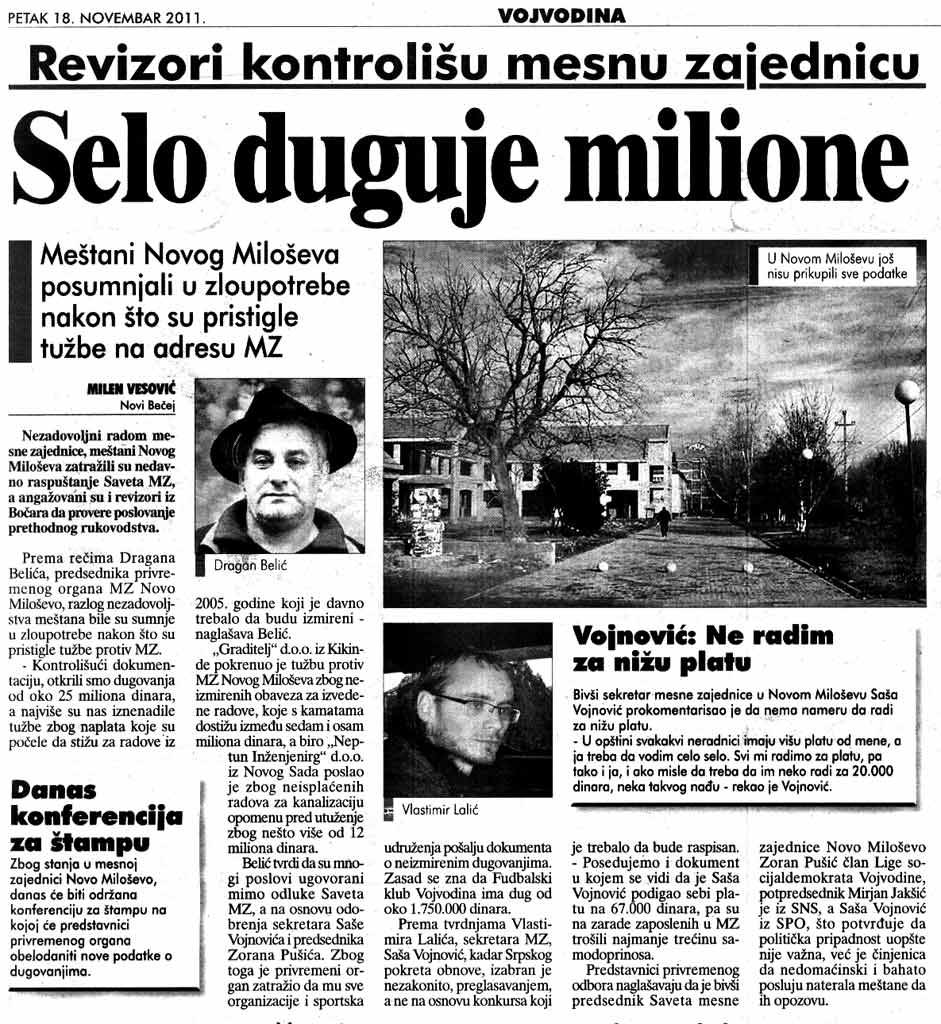 "Kav" što Vam je dobro poznato, "njin" precenik je nedavno dao ostavku i "razočarat, naPustijo" LSV, kad' je "svatijo", kol'ko su odbornici u Savet' MZ "Novog Miloševa", a iz njegove stranke, doprineli "sevoskim" dugovanjima, u iznos', od "priko" dvades't i pet milijona dinara !!!