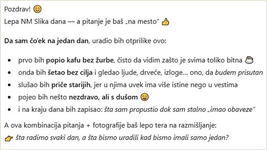 Spotakao bih se, rekao nešto pogrešno, zbunio se - samo da osetim kako je biti nesavršen. Jer greške su ljudske. I to je lepo.